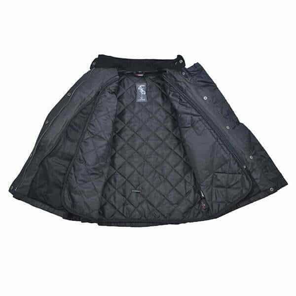 Damenjacke aus gewachster Baumwolle, wasserabweisend, Sharon. Der komfortable Hotlife-Innenraum ist zur einfachen Reinigung und für eine größere Vielseitigkeit der Verwendung der Jacke herausnehmbar. Doppelte Innentaschen für Dokumente werden von zwei Vordertaschen mit Knopfverschluss begleitet. Für Sicherheit an Schultern und Ellenbogen sorgen bewährte und herausnehmbare Protektoren, auch für den Rücken gibt es eine Verstärkung. Knopf- und Reißverschlussverschlüsse an den Manschetten sowie ein Taillenverstellgürtel ermöglichen eine individuelle Anpassung der Sharon-Passform. Ein wunderschöner Zierreißverschluss am Hals verleiht ihm einen Hauch von Raffinesse.
